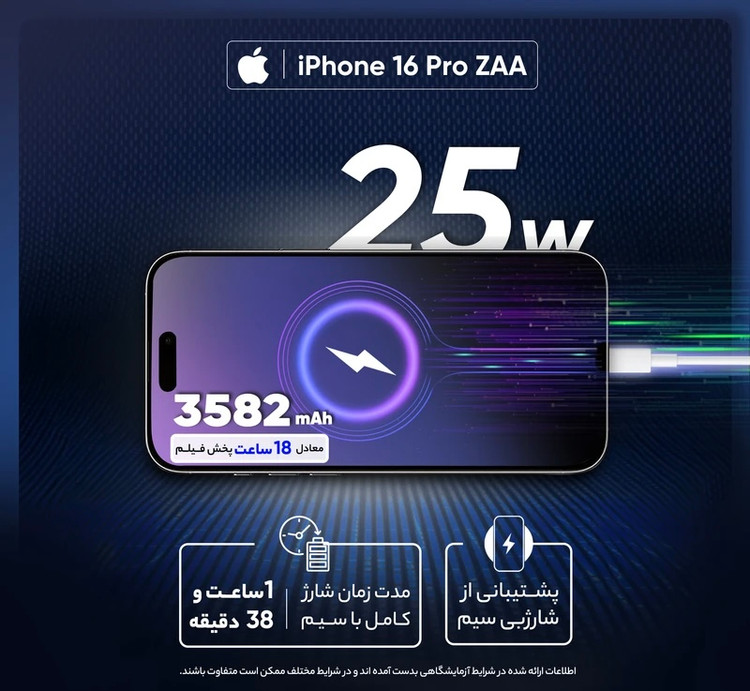 مشخصات باتری : امکان ۵۰ درصد شارژ در ۳۰ دقیقه / امکان شارژ با توان ۲۵ وات به صورت بیسیم (از راه MagSafe)/ امکان شارژ با توان ۱۵ وات به صورت بیسیم (از راه شارژرهای بیسیم سازگار با تکنولوژی Qi۲) / امکان شارژ معکوس با توان ۴.۵ وات به صورت با سیم /